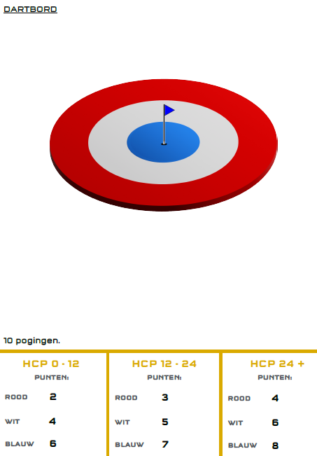 Het dartbord. Hier mogen 10 ballen per persoon op gespeeld worden. Sla je 3 ballen op het rood, 2 op het wit en 1 op blauw en zit je in hcp categorie 2? Dan behaal je 26 punten. Deze punten vul je in op de scorekaart. Nadat alle oefeningen gedaan zijn, tel je alle punten bij elkaar op en heb je je totaalscore.
