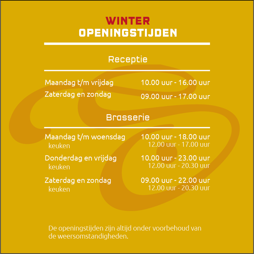 Met de winter in het verschiet passen wij onze openingstijden aan. Vanaf 1 november is onze horeca daarom op maandag, dinsdag en woensdag om 18.00 uur gesloten. Daarnaast is de receptie doordeweeks om 16.00 uur gesloten.