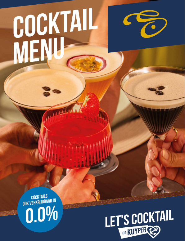 Onze cocktailkaart is helemaal vernieuwd! Van klassiekers tot verrassende creaties, er is voor ieder wat wils. Natuurlijk hebben we ook de 0.0-versies voor wie liever alcoholvrij geniet.