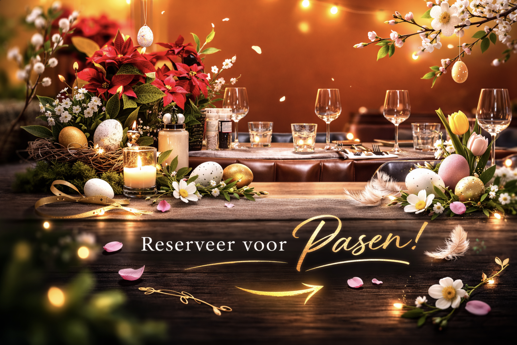 Op 5 en 6 april verwelkomen wij je graag in onze brasserie voor een sfeervolle paasbeleving. Geniet van gezellig tafelen in een warme, feestelijke setting β perfect om samen te komen met familie of vrienden.
