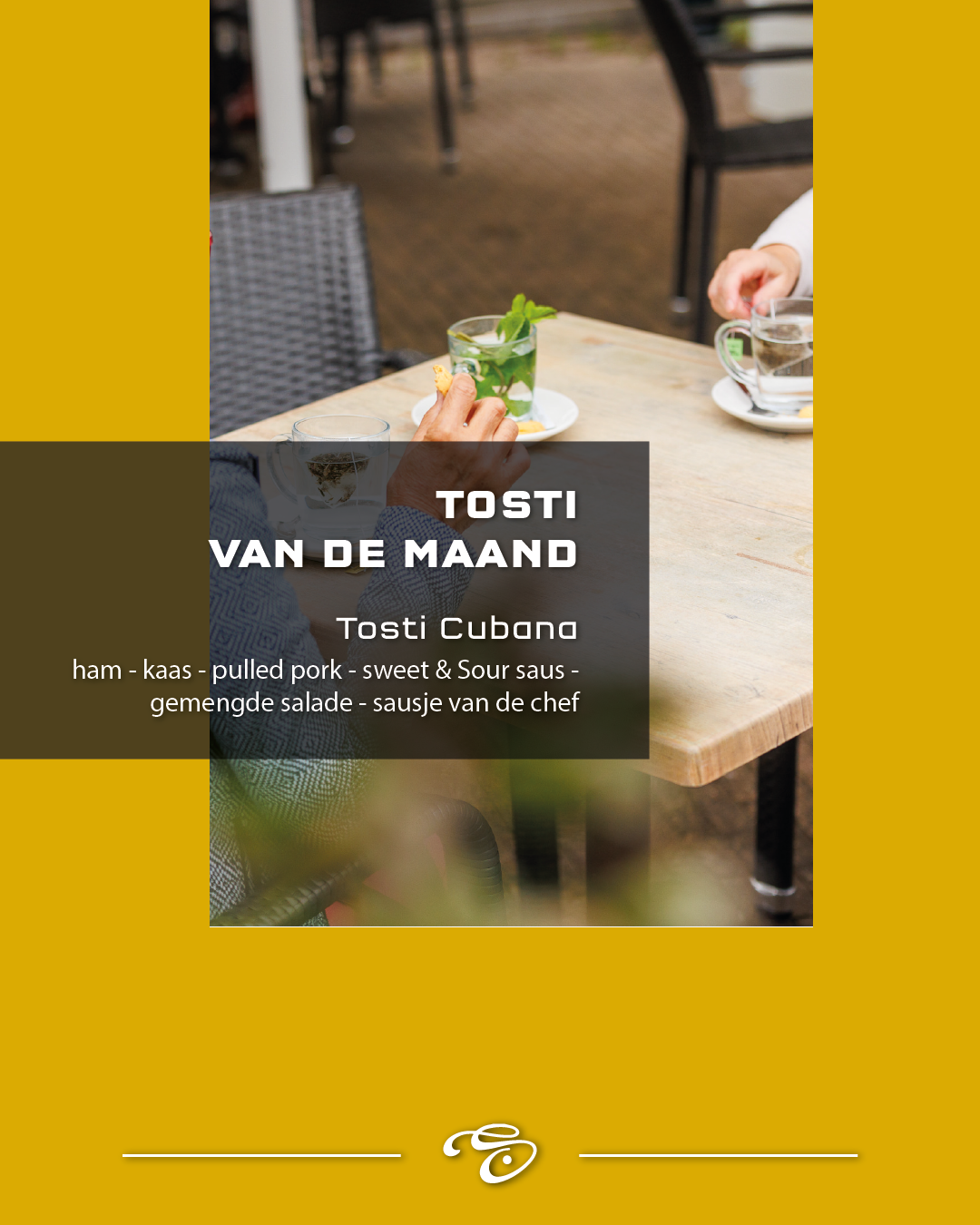 Een heerlijke combinatie van ham, kaas, pulled pork en sweet & sour saus, geserveerd met een frisse gemengde saladeen een verrassend sausje van de chef!